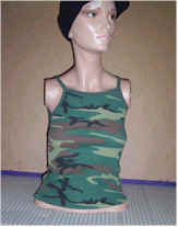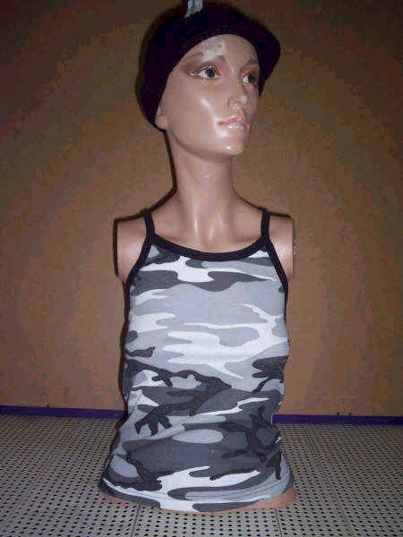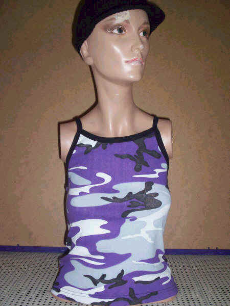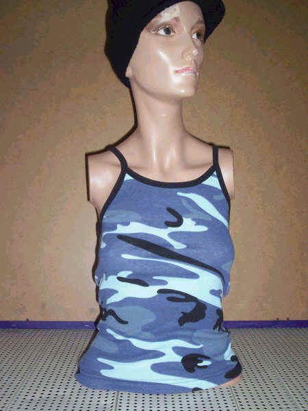 Ladies spaghetti strap tank tops come in four colors woodland camo, sky blue